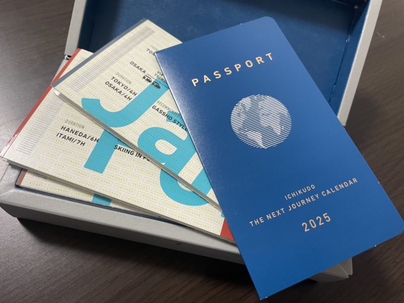 キャリーケース型の箱の中に、航空券のような形の各月のカレンダーが入っています。