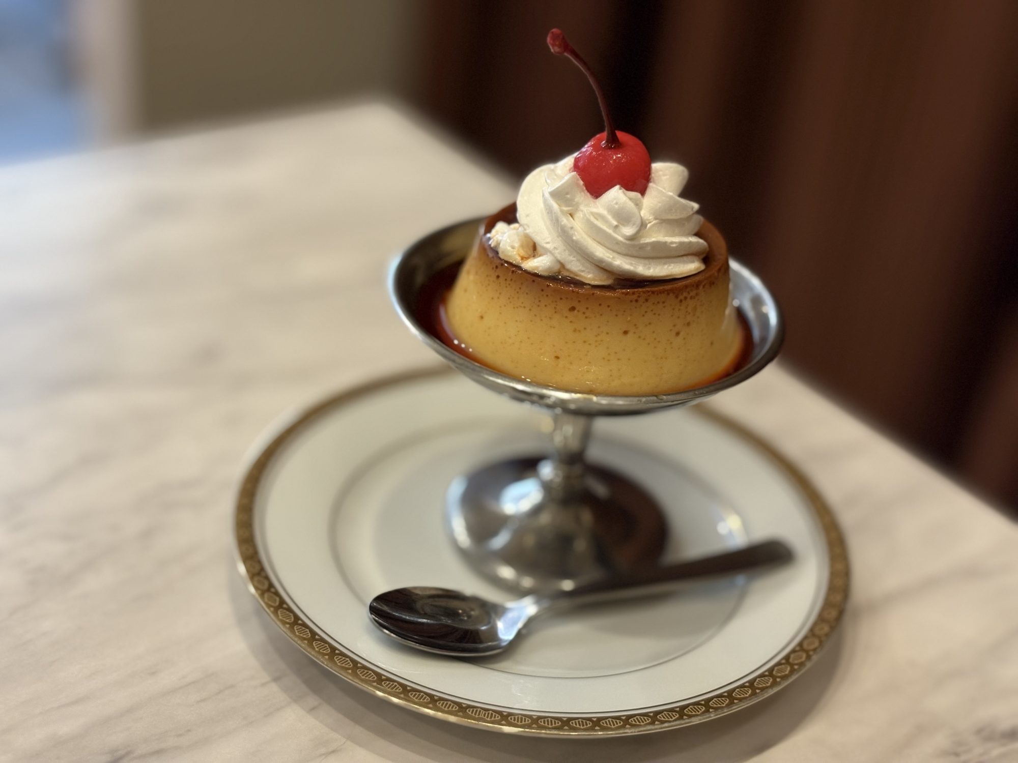 プリンの上に載ったホイップクリームとさくらんぼ、そして銀の器もなんてかわいいんでしょうか!